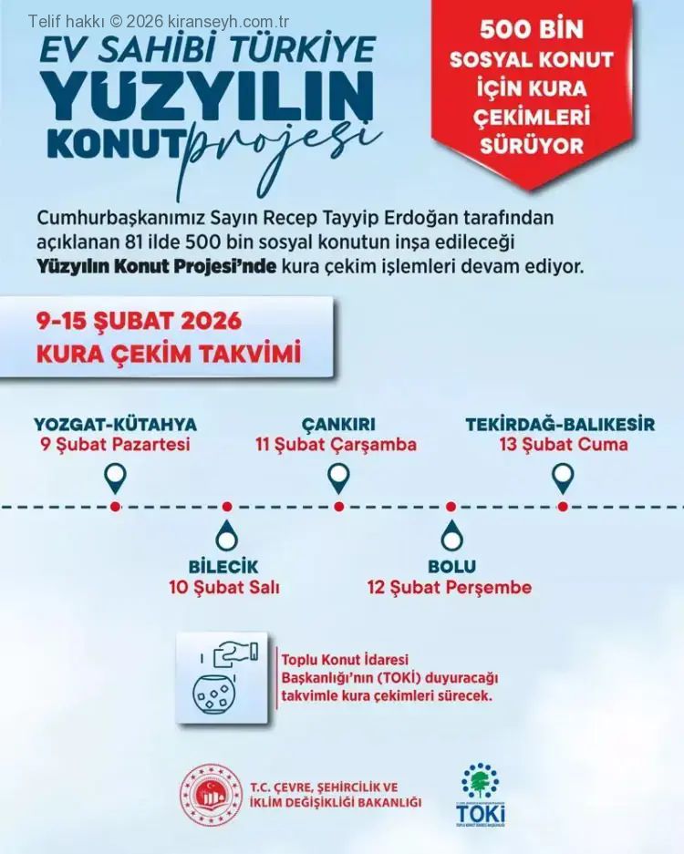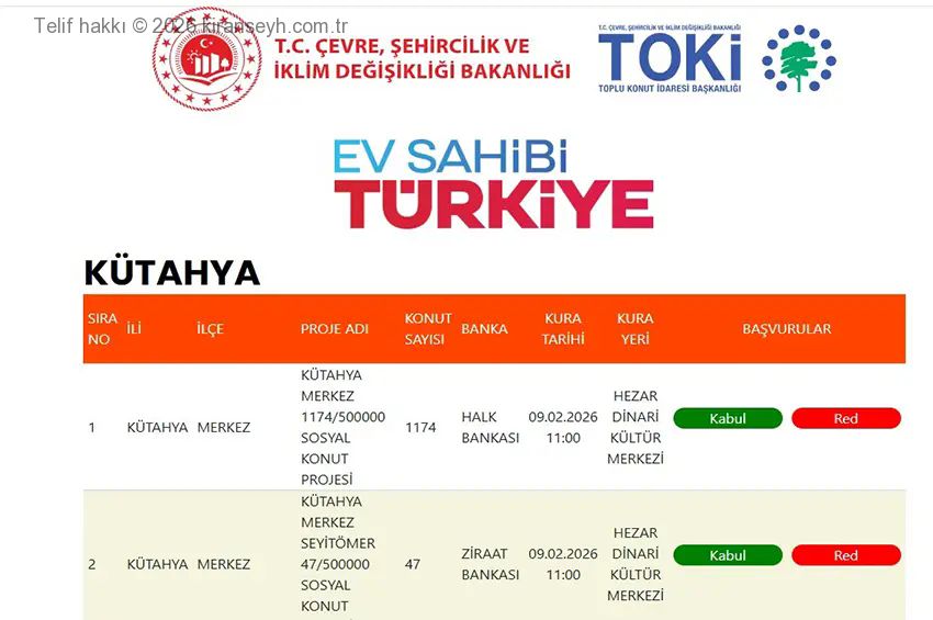 “500 Bin sosyal konut kampanyası kapsamında Kütahya ilinde yer alan Konut Projeleri için hak sahibi belirleme kurası 09 Şubat 2026 tarihinde saat 11:00'de 'Hezar Dinari Kültür Merkezi’nde' gerçekleştirilecektir.